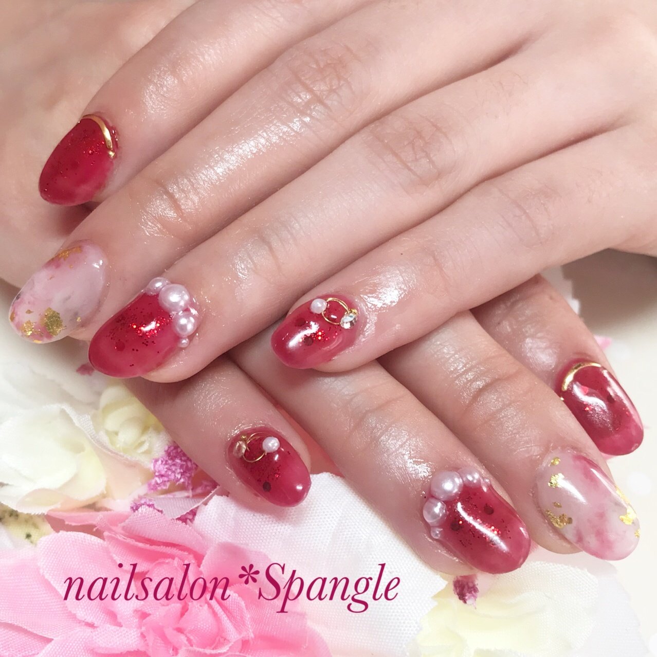 ショッキングピンク天然石 赤クリアカラー ゴールドフィルム Bigパールネイル 稲毛でネイルなら千葉市jr稲毛駅徒歩2分 パラジェル使用ネイルサロンcoconail 公式ブログ